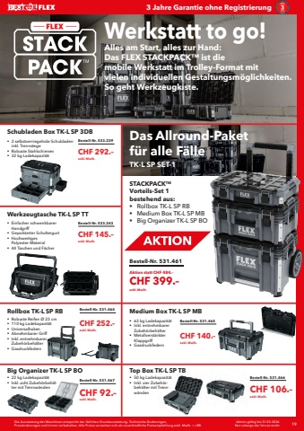 Die Ausstattung der Maschinen entspricht der %u00fcblichen Grundausstattung. Technische %u00c4nderungen, Preis%u00e4nderungen und Irrtum vorbehalten. Alle Preise verstehen sich als unverbindliche Preisempfehlung exkl. MwSt. + vRB. 19 Aktion g%u00fcltig bis 31.03.2026Nur solange der Vorrat reicht3 Jahre Garantie ohne RegistrierungWerkstatt to go!Alles am Start, alles zur Hand: Das FLEX STACKPACK%u2122 ist die mobile Werkstatt im Trolley-Format mit vielen individuellen Gestaltungsm%u00f6glichkeiten. So geht Werkzeugkiste.STACKPACKTMVorteils-Set 1bestehend aus:%u0083 Rollbox TK-L SP RB%u0083 Medium Box TK-L SP MB%u0083 Big Organizer TK-L SP BODas Allround-Paket f%u00fcr alle F%u00e4lle TK-L SP SET-1Bestell-Nr. 531.461Aktion statt CHF 484.%u2013CHF 399.%u2013exkl. MwSt.Werkzeugtasche TK-L SP TT%u0083 Einfacher schwenkbarer Handgriff%u0083 Gepolsterter Schultergurt%u0083 Hochwertiges Polyester-Material%u0083 44 Taschen und F%u00e4cher Bestell-Nr. 533.243CHF 145.%u2013exkl. MwSt.%u0083 3 selbstverriegelnde Schubladen inkl. Trennstege%u0083 Robuste Stahlschienen%u0083 32 kg Ladekapazit%u00e4tSchubladen Box TK-L SP 3DBBestell-Nr. 533.239CHF 292.%u2013exkl. MwSt.Rollbox TK-L SP RB Bestell-Nr. 531.464%u0083 Robuste Reifen %u00d8 23 cm%u0083 110 kg Ladekapazit%u00e4t%u0083 Universalhaken%u0083 Abnehmbarer Griff%u0083 Inkl. entnehmbarer Zubeh%u00f6rbeh%u00e4lter%u0083 GasdruckfedernCHF 252.%u2013exkl. MwSt.%u0083 63 kg Ladekapazit%u00e4t%u0083 Inkl. entnehmbarer Zubeh%u00f6rbeh%u00e4lter%u0083 Metallverst%u00e4rkter Klappgriff%u0083 Gasdruckfedern Medium Box TK-L SP MBBestell-Nr. 531.465CHF 140.%u2013exkl. MwSt.Big Organizer TK-L SP BOBestell-Nr. 531.467 %u0083 22 kg Ladekapazit%u00e4t%u0083 Inkl. acht Zubeh%u00f6rbeh%u00e4lter mit Trennw%u00e4ndenCHF 92.%u2013exkl. MwSt.Top Box TK-L SP TB%u0083 50 kg Ladekapazit%u00e4t Bestell-Nr. 531.466%u0083 Inkl. vier Zubeh%u00f6rbeh%u00e4lter mit Trennw%u00e4nden CHF 106.%u2013exkl. MwSt.
