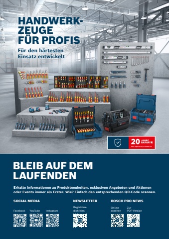 Facebook YouTube InstagramRegistriere dich hier:Zur PDF-VersionOnline ansehenHANDWERKZEUGE F%u00dcR PROFISF%u00fcr den h%u00e4rtesten Einsatz entwickeltErhalte Informationen zu Produktneuheiten, exklusiven Angeboten und Aktionen oder Events immer als Erster. Wie? Einfach den entsprechenden QR-Code scannen.BLEIB AUF DEM LAUFENDENSOCIAL MEDIA NEWSLETTER BOSCH PRO NEWS