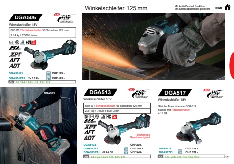 101DGA513DGA506DGA506ZJDGA506RTJ 2x 5.0 AhDGA513ZJDGA513RTJDGA5132x 5.0 AhDGA506DGA517DGA517ZJDGA517ZAh Ah 1.5 / 2.0 / 3.0 / 4.0 / 5.0 / 6.0 Ah Ah 1.5 / 2.0 / 3.0 / 4.0 / 5.0 / 6.0 Ah Ah 1.5 / 2.0 / 3.0 / 4.0 / 5.0 / 6.0 DGA513ZWinkelschleifer 125 mm HOME660 W / Schiebeschalter / %u00d8 Scheiben 125 mm 2.14 kg / 8%u2019500 U/minWinkelschleifer 18V Winkelschleifer 18V 660 W / Schiebeschalter / %u00d8 Scheiben 125 mm2.21 kg / 3%u2019000-8%u2019500 U/minStufenloseGeschwindigkeitMit Anti-Restart Funktion Mit Schruppscheibe geliefertGleiche Maschine wie DGA513, ausser mit Paddelschalter 2.11 kgWinkelschleifer 18V WinkelschleiferCHF 495.-CHF 249.-CHF 525.-CHF 289.-CHF 289.-CHF 239.-CHF 239.-