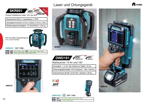 130SKR001SKR001ZAh Ah 40V 2.0 / 2.5 / 4.0 12V 1.5 / 2.0 / 4.0 / 5.0Ah Ah 18V 1.5 / 2.0 / 3.0 / 4.0 / 5.0 / 6.0 DWD181ZJDWD181 DWD181Ah Ah 18V : 1.5 / 2.0 / 3.0 / 4.0 / 5.0 / 6.0Ah Ah 14.4V : 1.5 / 3.0 / 6.0 DWD181SKR001Laser und Ortungsger%u00e4t HOMEGr%u00fcner Rotations-Laser 12V bis 40VMessbereich 800 m / Laserklasse 2 / IP67 Genauigkeit horizontal %u00b1 0.5 mm / vertikal %u00b1 0.75 mm (10m)Rotationsgeschwindigkeit : 0/150/300/600 / 3.89 kgMit manueller Doppelneigung in X- und Y-AchseGenauigkeit : +/- 5 mm / Min. Abstand zw. Objekte : 40 mmErfassungstiefe Metall / PVC-Schlauch : 180 / 120 mmAutonomie bis 28 Std. mit 6.0 Ah / Gewicht 1.05 kgWallscanner 14.4V und 18VCHF 1%u2019999.-CHF 1%u2019449.-