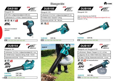 136DUB185Z DUB186ZDUB185 DUB186Ah Ah 1.5 / 2.0 / 3.0 / 4.0 / 5.0 / 6.0 Ah Ah 1.5 / 2.0 / 3.0 / 4.0 / 5.0 / 6.0 DUB187DUB187Z25 LDUB184ZDUB184Ah Ah 1.5 / 2.0 / 3.0 / 4.0 / 5.0 / 6.0 Ah Ah 1.5 / 2.0 / 3.0 / 4.0 / 5.0 / 6.0 DAS180DAS180ZAh Ah 1.5 / 2.0 / 3.0 / 4.0 / 5.0 / 6.0 DUB187DUB184RFBlasger%u00e4te HOMEBlasger%u00e4t 18V Blasger%u00e4t 18VLuftvolumen 3.2 m3/min / Luftgeschwindigkeit 81 m/s 0-18%u2019000 U/min / Gewicht 1.26 kgAutonomie mit 6 Ah : 26 - 160 minGleiche Maschine wie DUB185aber mit langer Blasd%u00fcse (Luftgeschwindigkeit 68 m/s)Gewicht 1.31 kgLuftvolumen : Blasen / Saugen 4.2 / 6.1 m3/minLuftgeschw. 64 m/s / 9%u2019000-13%u2019500 U/min / St%u00e4rke 4.2 N33 mbar / 3.25 kg / Autonomie mit 6.0 Ah : 14 minBlasger%u00e4t und Saugger%u00e4t18VLuftvolumen 13 m3/min / Luftgeschwindigkeit 52.1 m/s0-18%u2019000 U/min / Gewicht 2.38 kg / Kraft : 10.9 NAutonomie mit 6.0 Ah : 12 minBlasger%u00e4t 18VMit H%u00e4ckselfunktionmit R%u00e4der29,7 kPa / Luftgeschwindigkeit 0-200 m/s Luftvolumen 0-1.1 m3/min / Gewicht 0.83 kgBlasger%u00e4t 18VWird mit 5 Aufs%u00e4tzen geliefertCHF 89.- CHF 99.-CHF 259.-CHF 189.-CHF 199.-CHF 335.-