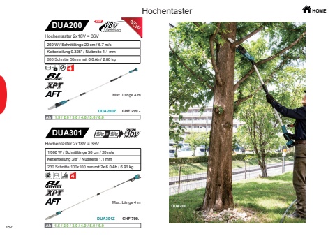 152DUA301DUA301ZAh Ah 1.5 / 2.0 / 3.0 / 4.0 / 5.0 / 6.0 DUA200DUA200ZAh Ah 1.5 / 2.0 / 3.0 / 4.0 / 5.0 / 6.0 DUA200HOMEHochentaster 2x18V = 36V1%u2019000 W / Schnittl%u00e4nge 30 cm / 20 m/sKettenteilung 3/8\230 Schnitte 100x100 mm mit 2x 6.0 Ah / 6.91 kgMax. L%u00e4nge 4 mHochentaster 2x18V = 36V260 W / Schnittl%u00e4nge 20 cm / 6.7 m/sKettenteilung 0.325\600 Schnitte 50mm mit 6.0 Ah / 2.80 kgMax. L%u00e4nge 4 mHochentasterCHF 799.-CHF 299.-