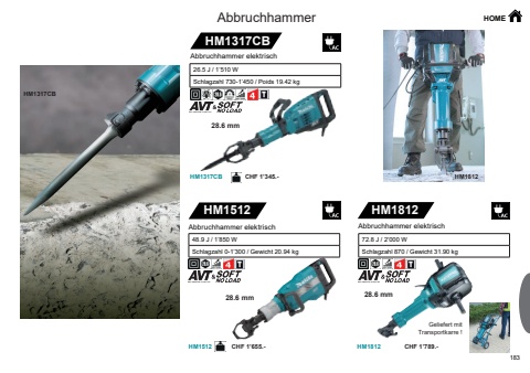 183HM1317CBHM1812HM1317CBHM1812HM1512HM151228.6 mm28.6 mm 28.6 mmHM1812HM1317CBCHF 1%u2019345.-CHF 1%u2019655.- CHF 1%u2019789.-HOMEAbbruchhammer elektrisch26.5 J / 1%u2019510 WSchlagzahl 730-1%u2019450 / Poids 19.42 kgAbbruchhammer elektrisch72.8 J / 2%u2019000 WSchlagzahl 870 / Gewicht 31.90 kgGeliefert mit Transportkarre !Abbruchhammer elektrisch48.9 J / 1%u2019850 WSchlagzahl 0-1%u2019300 / Gewicht 20.94 kgAbbruchhammer