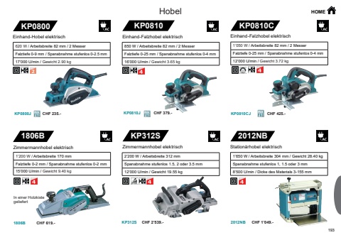 193KP0810KP0810JKP0800KP0800JKP0810CKP0810CJ1806B1806B KP312SKP312S2012NB2012NBCHF 235.- CHF 379.- CHF 425.-CHF 619.- CHF 2%u2019539.- CHF 1%u2019049.-Hobel HOMEEinhand-Falzhobel elektrisch850 W / Arbeitsbreite 82 mm / 2 MesserFalztiefe 0-25 mm / Spanabnahme stufenlos 0-4 mm16%u2019000 U/min / Gewicht 3.65 kg620 W / Arbeitsbreite 82 mm / 2 MesserFalztiefe 0-9 mm / Spanabnahme stufenlos 0-2.5 mm17%u2019000 U/min / Gewicht 2.90 kgEinhand-Hobel elektrisch Einhand-Falzhobel elektrisch 1%u2019050 W / Arbeitsbreite 82 mm / 2 MesserFalztiefe 0-25 mm / Spanabnahme stufenlos 0-4 mm12%u2019000 U/min / Gewicht 3.72 kg1%u2019200 W / Arbeitsbreite 170 mmFalztiefe 0-2 mm / Spanabnahme stufenlos 0-2 mm15%u2019000 U/min / Gewicht 9.40 kgZimmermannhobel elektrisch Zimmermannhobel elektrisch 2%u2019200 W / Arbeitsbreite 312 mm Spanabnahme stufenlos 1.5, 2 oder 3.5 mm12%u2019000 U/min / Gewicht 19.55 kgIn einer HolzkistegeliefertStation%u00e4rhobel elektrisch1%u2019650 W / Arbeitsbreite 304 mm / Gewicht 28.40 kgSpanabnahme stufenlos 1, 1.5 oder 3 mm 8%u2019500 U/min / Dicke des Materials 3-155 mm