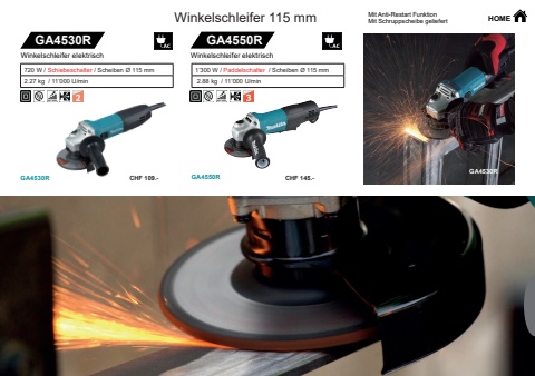 201GA4550RGA4550RGA4530RGA4530RGA4530RCHF 109.- CHF 145.-Winkelschleifer 115 mm HOMEWinkelschleifer elektrisch720 W / Schiebeschalter / Scheiben %u00d8 115 mm2.27 kg / 11%u2019000 U/minWinkelschleifer elektrisch 1%u2019300 W / Paddelschalter / Scheiben %u00d8 115 mm 2.88 kg / 11%u2019000 U/minMit Anti-Restart Funktion Mit Schruppscheibe geliefertWinkelschleifer