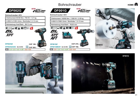 HOME21DF002GDF002GZDF002GA202 2x 2.0 AhDF001GDF001GZDF001GM201 2x 4.0 AhDF001GAh Ah 2.0 / 2.5 / 4.0 / 4.0F / 5.0 / 8.0 Ah Ah 2.0 / 2.5 / 4.0 / 4.0F / 5.0 / 8.0DF001G DF002GBohrschrauber 40VDrehmoment 64/30 Nm / 750 W / 1.21 kg0-600/ 0-2%u2019200 U/min / Bohrfutter1.5-13 mmBohrleistung Holz/Stahl : 38/13 mmBohrschrauber 40VDrehmoment 140/68 Nm / 1%u2019000 W / 2.00 kg0-650/ 0-2%u2019600 U/min / Bohrfutter 1.5-13 mm Bohrleistung Holz/Stahl : 76/20 mm BohrschrauberCHF 169.-CHF 585.-CHF 279.-CHF 769.-