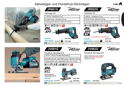 HOME292x 4.0 AhJR001GZJR001GM201JR001G JR002GJR002GZJR002GM201 2x 4.0 AhAh Ah 2.5 / 4.0 / 4.0F / 5.0 / 8.0 Ah Ah 4.0 / 4.0F / 5.0 / 8.0JV001GZJV001GJV001GD101 1x 2.5 Ah JV002GZJV002GAh Ah 2.0 / 2.5 / 4.0 / 4.0F Ah Ah 2.0 / 2.5 / 4.0 / 4.0F JR002GJV001GS%u00e4bels%u00e4ge 40V1%u2019100 W / Hubh%u00f6he 32 mm0-3%u2019000 U/min / Gewicht 3.54 kgLeistung Holz 255 mm / Rohr-%u00d8 130 mm S%u00e4bels%u00e4ge 40V1%u2019800 W / Hubh%u00f6he 32 mm 0-4%u2019800 U/min/ Gewicht 3.93 kgLeistung Holz 255 mm / Rohr-%u00d8 130 mm  mit einstellbarem PendelhubS%u00e4bels%u00e4gen und Pendelhub-Stichs%u00e4genPendelhub-Stichs%u00e4ge 40V Pendelhub-Stichs%u00e4ge 40VGleiche Maschine wie JV001Gausser mit oberem RundgriffGewicht 2.05 kg700 W / 3-fache PendelhubeinstellungHubh%u00f6he 26 mm / 800-3%u2019500 U/min / Gewicht 1.92 kgLeistung Holz / Alu / Weichstahl 135 / 20 / 10 mmWerkzeugloser S%u00e4geblattwechselHolzs%u00e4genCHF 305.-CHF 829.- CHF 899.-CHF 375.-CHF 309.-CHF 599.- CHF 309.-