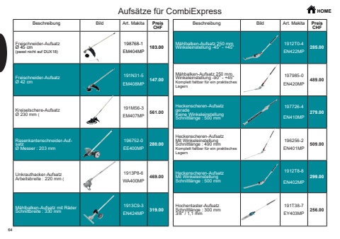 HOME64Beschreibung Bild Art. Makita PreisCHFFreischneider-Aufsatz %u00d8 45 cm(passt nicht auf DUX18)198768-1EM404MP183.00Freischneider-Aufsatz %u00d8 42 cm 191N31-5EM408MP147.00Kreiselschere-Aufsatz %u00d8 230 mm (191M56-3EM407MP561.00Rasenkantenschneider-Auf- satz%u00d8 Messer : 203 mm196752-0EE400MP280.00Unkrauthacker-Aufsatz Arbeitsbreite : 220 mm (1913P8-6WA400MP469.00M%u00e4hlbalken-Aufsatz mit R%u00e4derSchnittbreite : 330 mm 1913C9-3EN424MP319.00Beschreibung Bild Art. Makita PreisCHFM%u00e4hlbalken-Aufsatz 250 mmWinkeleinstellung -45%u00b0 - +45%u00b0 1912T0-4EN422MP285.00M%u00e4hbalken-Aufsatz 250 mm Winkeleinstellung -90%u00b0 - +45%u00b0Komplett faltbar f%u00fcr ein praktisches Lagern197985-0EN420MP489.00Heckenscheren-Aufsatz geradeKeine Winkeleinstellung Schnittl%u00e4nge : 500 mm197726-4EN410MP279.00Heckenscheren-AufsatzMit WinkeleinstellungSchnittl%u00e4nge : 490 mmKomplett faltbar f%u00fcr ein praktisches Lagern196256-2EN401MP509.00Heckenscheren-AufsatzMit WinkeleinstellungSchnittl%u00e4nge : 500 mm1912T8-8EN402MP299.00Hochentaster-Aufsatz Schnittl%u00e4nge : 300 mm 3/8\191T38-7EY403MP256.00Aufs%u00e4tze f%u00fcr CombiExpress