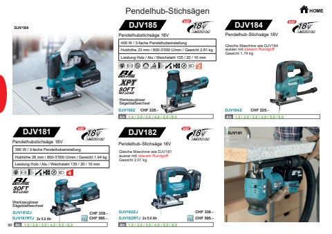 90DJV181DJV181ZJDJV181RTJ 2x 5.0 AhDJV182DJV182ZJDJV182RTJ 2x 5.0 AhDJV181Ah Ah 1.5 / 2.0 / 3.0 / 4.0 / 5.0 / 6.0 Ah Ah 1.5 / 2.0 / 3.0 / 4.0 / 5.0 / 6.0 DJV184DJV184ZDJV185DJV185ZAh Ah 1.5 / 2.0 / 3.0 / 4.0 / 5.0 / 6.0 Ah Ah 1.5 / 2.0 / 3.0 / 4.0 / 5.0 / 6.0 DJV184HOME390 W / 3-fache PendelhubeinstellungHubh%u00f6he 26 mm / 800-3%u2019500 U/min / Gewicht 1.94 kgLeistung Holz / Alu / Weichstahl 135 / 20 / 10 mmPendelhubstichs%u00e4ge 18V Pendelhub-Stichs%u00e4ge 18VPendelhub-Stichs%u00e4genGleiche Maschine wie DJV181ausser mit oberem RundgriffGewicht 2.01 kgWerkzeugloser S%u00e4geblattwechselPendelhubstichs%u00e4ge 18V400 W / 3-fache PendelhubeinstellungHubh%u00f6he 23 mm / 800-3%u2019000 U/min / Gewicht 2.61 kgLeistung Holz / Alu / Weichstahl 135 / 20 / 10 mmWerkzeugloser S%u00e4geblattwechselGleiche Maschine wie DJV184ausser mit oberem RundgriffGewicht 1.74 kgPendelhub-Stichs%u00e4ge 18VHolzs%u00e4genCHF 339.-CHF 595.-CHF 339.-CHF 595.-CHF 225.- CHF 225.-