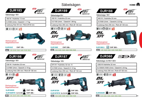 91DJR183DJR183ZDJR186DJR186ZKDJR186RTE 2x 5.0 AhDJR189DJR189Z DJR188ZJDJR188Ah Ah 1.5 / 2.0 / 3.0 / 4.0 / 5.0 / 6.0 Ah Ah 1.5 / 2.0 / 3.0 / 4.0 / 5.0 / 6.0 Ah Ah 1.5 / 2.0 / 3.0 / 4.0 / 5.0 / 6.0 Ah Ah 1.5 / 2.0 / 3.0 / 4.0 / 5.0 / 6.0 DJR187DJR187ZKDJR187RTE 2x 5.0 AhAh Ah 1.5 / 2.0 / 3.0 / 4.0 / 5.0 / 6.0 DJR360ZKDJR360Ah Ah 1.5 / 2.0 / 3.0 / 4.0 / 5.0 / 6.0 S%u00e4bels%u00e4gen HOME180 W / Hubh%u00f6he 13 mm 0-3%u2019000 U/min / Gewicht 1.17 kgLeistung Holz 50 mm / Rohr-%u00d8 50 mm S%u00e4bels%u00e4ge 18V530 W / Hubh%u00f6he 32 mm0-2%u2019800 U/min / Gewicht 3.15 kgLeistung Holz 255 mm / Rohr-%u00d8 130 mm S%u00e4bels%u00e4ge 18V450 W / Hubh%u00f6he 22 mm0-3%u2019100 U/min / Gewicht 1.88 kgLeistung Holz 255 mm / Rohr-%u00d8 130 mm S%u00e4bels%u00e4ge18V460 W / Hubh%u00f6he 20 mm0-3%u2019000 U/min / Gewicht 2.22 kgLeistung Holz 255 mm / Rohr-%u00d8 130 mm S%u00e4bels%u00e4ge 18VWerkzeugloser S%u00e4geblattwechsel Werkzeugloser S%u00e4geblattwechselWerkzeugloser S%u00e4geblattwechselWerkzeugloser S%u00e4geblattwechsel670 W / Hubh%u00f6he 32 mm S0-3%u2019000 U/min / Gewicht 3.12 kgLeistung Holz 255 mm / Rohr-%u00d8 130 mm S%u00e4bels%u00e4ge 18V S%u00e4bels%u00e4ge 2x18V=36V1350 W Hubh%u00f6he 32 mm0-2%u2019300/0-3%u2019000 U/min / Gewicht 3.33 kgLeistung Holz 255 mm / Rohr-%u00d8 130 mm CHF 129.-CHF 469.-CHF 259.-CHF 199.-CHF 285.-CHF 295.-CHF 539.- CHF 359.-
