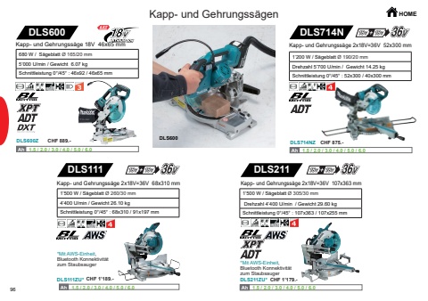 96DLS714NZDLS714NDLS111DLS111ZU*DLS211DLS211ZU*DLS600Ah Ah 1.5 / 2.0 / 3.0 / 4.0 / 5.0 / 6.0Ah Ah 1.5 / 2.0 / 3.0 / 4.0 / 5.0 / 6.0 Ah Ah 1.5 / 2.0 / 3.0 / 4.0 / 5.0 / 6.0DLS600ZDLS600Ah Ah 1.5 / 2.0 / 3.0 / 4.0 / 5.0 / 6.0Kapp- und Gehrungss%u00e4gen HOMEKapp- und Gehrungss%u00e4ge 2x18V=36V 52x300 mm1%u2019200 W / S%u00e4geblatt %u00d8 190/20 mmDrehzahl 5%u2019700 U/min / Gewicht 14.25 kg Schnittleistung 0%u00b0/45%u00b0 : 52x300 / 40x300 mmKapp- und Gehrungss%u00e4ge 2x18V=36V 68x310 mm1%u2019500 W / S%u00e4geblatt %u00d8 260/30 mm 4%u2019400 U/min / Gewicht 26.10 kgSchnittleistung 0%u00b0/45%u00b0 : 68x310 / 91x197 mmKapp- und Gehrungss%u00e4ge 2x18V=36V 107x363 mm1%u2019500 W / S%u00e4geblatt %u00d8 305/30 mm Drehzahl 4%u2019400 U/min / Gewicht 29.60 kg Schnittleistung 0%u00b0/45%u00b0 : 107x363 / 107x255 mm*Mit AWS-Einheit, Bluetooth Konnektivit%u00e4t zum Staubsauger *Mit AWS-Einheit, Bluetooth Konnektivit%u00e4t zum StaubsaugerKapp- und Gehrungss%u00e4ge 18V 46x65 mm680 W / S%u00e4geblatt %u00d8 165/20 mm5%u2019000 U/min / Gewicht 6.07 kgSchnittleistung 0%u00b0/45%u00b0 : 46x92 / 46x65 mmCHF 875.-CHF 1%u2019189.- CHF 1%u2019179.-CHF 889.-