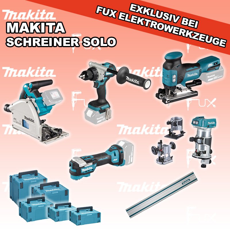 Zu "Akku Maschinen SET 18 Volt" von Makita FUX SPECIAL EXKLUSIV BEI FUX Makita 5-teiliges Schreiner Solo 1 Bestell- und Artikelnummer: Schreiner Solo 1 DSP600ZJ Eintauch-KreissägeAkkuspannung 2 x 18 V Sägeblatt (Ø) 165 mm Schnitttiefe bei 90° 56 mm Gewicht 5.1 kg Infos DTM52Z Multifunktions WerkzeugAkkuspannung 18 V Schwingungen 10000 - 20000 min-1 Werkzeugaufnahme Starlock Max System Gewicht inkl. Akku 2.0 kg Infos DJV18ZJ Akku-StichsägeAkkuspannung 18 V Hubzahl 800 - 3500/ min Schnittleistung Holz 135 mm / Stahl 10 mm Gewicht 2.5 kgInfos DRT50ZJX11 Akku-Einhandfräse / Kantenfräse Akkuspannung 18 V Leerlaufdrehzahl 10000 - 30000 min-1 Tiefeneinstellung bis 40 mm Gewicht 2.0 kgInfos DDF492Z Akku-BohrschrauberAkkuspannung 18 V Leerlaufdrehzahl 0 - 550 / 0 - 2100 min⁻¹ Drehmoment hart / weich 130 / 65 Nm Gewicht inkl. Akku 2.3 - 2.6 kgInfos Führungsschiene L = 140 cmgeeignet für SP6000 Handkreissäge mit passenden Adapter Auch für weitere Handkreissägen und Stichsägen geeignet mit passendem Adapter. ( 194579-2 )Infos MAKPAC Gr. 2Produktabmessung (L x B x H) 395 x 295 x 163 mm Infos MAKPAC Gr. 3Produktabmessung (L x B x H) 377 x 277 x 176 mm Infos Einsatz für Diverse Akkuschrauber Einsatz für DDF343ZJ, DDF441, DDF446, DDF448, DDF451, DDF453, DDF456R, DDF458, DDF459, DDF480, DDF481, DDF482, DDF484, DDF485, DDF486, DHP441, DHP446, DHP448, DHP451, DHP456, DHP458, DHP459, DHP470, DHP480, DHP481, DHP482, DHP484, DHP485, DHP486, DLX2126TJ1, DLX3092TJInfos Einsatz für DTM52 Einsatz für DTM52 Makpac Koffer Typ C (821551-8) Infos OHNE AKKUS UND LADEGERÄT Standard-Ausrüstung In diesem Set enthalten: DSP600ZJ Eintauch-Kreissäge DTM52Z Multifunktions Werkzeug DJV18ZJ Akku-Stichsäge DRT50ZJX11 Akku-Einhandfräse / Kantenfräse DDF492Z Akku-Bohrschrauber Führungsschiene L = 140 cm MAKPAC Gr. 2 MAKPAC Gr. 3 Einsatz für Diverse Akkuschrauber Einsatz für DTM52 Zubehör Verbrauchsmaterial Listenpreis CHF 2'123.00 Fuxpreis CHF 1'431.00 inkl. 8.1% MwSt, inkl vRG Versand CHF 15.00 Kein Grauimport! Produkt bestellen 1 Stück 2 Stück 3 Stück 4 Stück 5 Stück 6 Stück 7 Stück 8 Stück 9 Stück 10 Stück Option: Makita BL 1860 B ( Li-lon Akku ) für CHF 95.- statt CHF 124.-Infos Alle Angaben ohne Gewähr und solange Vorrat reicht!Wiederverkäufer werden? Produkt als PDF NEUHEITAKTION 32%