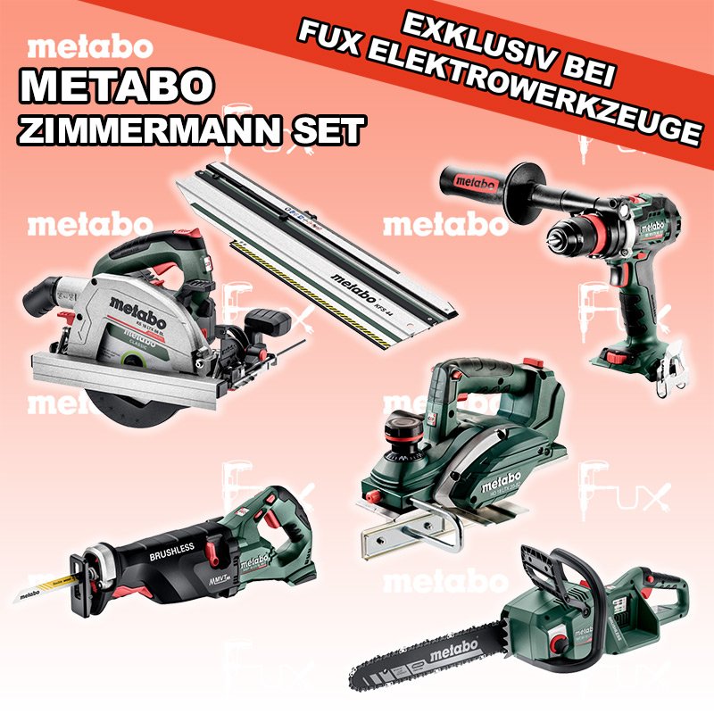 Das Ladenlokal bleibt vom 25. Dezember 2025 bis am 04. Januar 2026 geschlossen. Bestellungen und Lieferungen von Neugeräten werden trotz Ferienabwesenheit in gewohnter Fux-Manier entgegengenommen und ausgeliefert. Heute auf dieses Produkt 27% Rabatt! Zu "Zimmermann Set" von Metabo FULL Service: 36 Monate zum Nulltarif für Sie! Weitere Infos zum FULL Service Dieses Produkt ist CAS kompatibel! Weitere Infos zu CAS Sparfux Aktionen FUX SPECIAL EXKLUSIV BEI FUX Metabo Zimmermann SET 4 SOLO Bestell- und Artikelnummer: Zimmermann SET 4 SOLO BS 18 LTX BL Q I Akku-BohrschrauberAkkuspannung 18 V Drehzahl 0-550 / 0-2000 U/min Drehmoment hart / weich 130 / 65 Nm Gewicht (mit Akkupack) 2.3 kgInfos MS 36-18 LTX BL 40 Akku KettensägeAkkuspannung 18 V Schnittlänge 36 cm Max. Kettengeschwindigkeit 22 m/s Gewicht mit Akkupack 4,6 kgInfos SSEP 18 LTX BL MVT Akku-SäbelsägeAkkuspannung 18 V Hubzahl bei Leerlauf 0 - 3.000 /min Gewicht (mit Akkupack) 4.6 kgInfos HO 18 LTX 20-82 Akku-Einhand-HobelAkkuspannung 18 V Hobelbreite 82 mm Spanabnahme einstellbar 0-2 mm Gewicht 3.5 KgInfos KS 18 LTX 66 BL Akku HandkreissägeAkkuspannung 18 V Schnitt-Tiefe bei 90° 0-66 mm Sägeblatt 165 mm Gewicht 4.5 kgInfos Kappschiene KFS 44Gesamtlänge 834 mm Schnittlänge 440 mmInfos Registriere die in diesem Set vorhandenen Metabo Maschinen auf metabo.ch, und ergattere dir bis zu 5 Gratis Akkus!Zusätzlich offerieren wir zu diesem Set einen Gratis Akku!OHNE AKKUS UND LADEGERÄT Standard-Ausrüstung In diesem Set enthalten: BS 18 LTX BL Q I Akku-Bohrschrauber MS 36-18 LTX BL 40 Akku Kettensäge SSEP 18 LTX BL MVT Akku-Säbelsäge HO 18 LTX 20-82 Akku-Einhand-Hobel KS 18 LTX 66 BL Akku Handkreissäge Kappschiene KFS 44 Listenpreis CHF 2'073.50 Fuxpreis CHF 1'499.00 inkl. 8.1% MwSt, inkl vRG Versand CHF 25.00 Kein Grauimport! Produkt bestellen 1 Stück 2 Stück 3 Stück 4 Stück 5 Stück 6 Stück 7 Stück 8 Stück 9 Stück 10 Stück Alle Angaben ohne Gewähr und solange Vorrat reicht!Wiederverkäufer werden? Produkt als PDF NEUHEITAKTION 27%