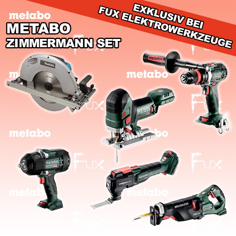 Das Ladenlokal bleibt vom 25. Dezember 2025 bis am 04. Januar 2026 geschlossen. Bestellungen und Lieferungen von Neugeräten werden trotz Ferienabwesenheit in gewohnter Fux-Manier entgegengenommen und ausgeliefert. Heute auf dieses Produkt 30% Rabatt! Zu "Zimmermann Set" von Metabo FULL Service: 36 Monate zum Nulltarif für Sie! Weitere Infos zum FULL Service Dieses Produkt ist CAS kompatibel! Weitere Infos zu CAS Sparfux Aktionen FUX SPECIAL EXKLUSIV BEI FUX Metabo Zimmermann SET 19 SOLO Bestell- und Artikelnummer: Zimmermann SET 19 SOLO BS 18 LTX BL Q I Akku-BohrschrauberAkkuspannung 18 V Drehzahl 0-550 / 0-2000 U/min Drehmoment hart / weich 130 / 65 Nm Gewicht (mit Akkupack) 2.3 kgInfos SSW 18 LTX 1450 BL Akku-SchlagschrauberAkkuspannung 18 V Anziehdrehmoment 1450 Nm Werkzeugaufnahme 1/2" Infos SSEP 18 LTX BL MVT Akku-SäbelsägeAkkuspannung 18 V Hubzahl bei Leerlauf 0 - 3.000 /min Gewicht (mit Akkupack) 4.6 kgInfos 5143 R HandkreissägeLeistungsaufnahme 2200 Watt 50 - 130 mm Schnitt-Tiefe bei 90° Leerlaufdrehzahl 2700 U/min Gewicht 14.5 kgInfos MT 18 LTX BL QSL Akku-Multitool Akkuspannung 18 V Schwingzahl bei Leerlauf 8.000 - 20.000 /min Schleifplatte, Maß Eck zu Eck 93 mm Gewicht 1.7 kgInfos STA 18 LTX 150 BL Akku-StichsägeAkkuspannung 18 V Hubzahl 1.000-3.500 /min Gewicht ohne Akkupack 1.9 kgInfos Registriere die in diesem Set vorhandenen Metabo Maschinen auf metabo.ch, und ergattere dir bis zu 5 Gratis Akkus!Zusätzlich offerieren wir zu diesem Set einen Gratis Akku!OHNE AKKUS UND LADEGERÄT Standard-Ausrüstung In diesem Set enthalten: BS 18 LTX BL Q I Akku-Bohrschrauber SSW 18 LTX 1450 BL Akku-Schlagschrauber SSEP 18 LTX BL MVT Akku-Säbelsäge 5143 R Handkreissäge MT 18 LTX BL QSL Akku-Multitool STA 18 LTX 150 BL Akku-Stichsäge Listenpreis CHF 3'054.00 Fuxpreis CHF 2'112.00 inkl. 8.1% MwSt, inkl vRG Versand CHF 25.00 Kein Grauimport! Produkt bestellen 1 Stück 2 Stück 3 Stück 4 Stück 5 Stück 6 Stück 7 Stück 8 Stück 9 Stück 10 Stück Alle Angaben ohne Gewähr und solange Vorrat reicht!Wiederverkäufer werden? Produkt als PDF NEUHEITAKTION 30%