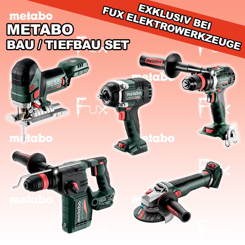Das Ladenlokal bleibt vom 25. Dezember 2025 bis am 04. Januar 2026 geschlossen. Bestellungen und Lieferungen von Neugeräten werden trotz Ferienabwesenheit in gewohnter Fux-Manier entgegengenommen und ausgeliefert. Heute auf dieses Produkt 27% Rabatt! Zu "Bau / Tiefbau Set" von Metabo FULL Service: 36 Monate zum Nulltarif für Sie! Weitere Infos zum FULL Service Sparfux Aktionen FUX SPECIAL EXKLUSIV BEI FUX Metabo Bau / Tiefbau Set 4 SOLO Bestell- und Artikelnummer: Bau / Tiefbau Set 4 SOLO BS 18 LTX BL Q I Akku-BohrschrauberAkkuspannung 18 V Drehzahl 0-550 / 0-2000 U/min Drehmoment hart / weich 130 / 65 Nm Gewicht (mit Akkupack) 2.3 kgInfos STA 18 LTX 150 BL Akku-StichsägeAkkuspannung 18 V Hubzahl 1.000-3.500 /min Gewicht ohne Akkupack 1.9 kgInfos KH 18 LTX BL 28 Q Akku-KombihammerAkkuspannung 18 V Einzelschlagstärke 3 J Bohrleistung in Beton 28 mm Gewicht ohne Akkupack 3,4 kgInfos WB 18 LTX BL 15-125 Quick Akku-Winkelschleifer Akkuspannung 18 V so stark wie ein 1500 Watt Netzgerät Drehzahl 10000 U / min Ø 125 mm Scheiben Gewicht mit Akkupack 2,7 kgInfos SSW 18 LTX 800 BL Akku-Schlagschrauber Akkuspannung 18 V Anziehdrehmoment 800 Nm Werkzeugaufnahme 1/2" Gewicht 2.6 kgInfos Registriere die in diesem Set vorhandenen Metabo Maschinen auf metabo.ch, und ergattere dir bis zu 5 Gratis Akkus!Zusätzlich offerieren wir zu diesem Set einen Gratis Akku!OHNE AKKUS UND LADEGERÄT Standard-Ausrüstung In diesem Set enthalten: BS 18 LTX BL Q I Akku-Bohrschrauber STA 18 LTX 150 BL Akku-Stichsäge KH 18 LTX BL 28 Q Akku-Kombihammer WB 18 LTX BL 15-125 Quick Akku-Winkelschleifer SSW 18 LTX 800 BL Akku-Schlagschrauber Listenpreis CHF 1'915.00 Fuxpreis CHF 1'384.00 inkl. 8.1% MwSt, inkl vRG Frankolieferung Kein Grauimport! Produkt bestellen 1 Stück 2 Stück 3 Stück 4 Stück 5 Stück 6 Stück 7 Stück 8 Stück 9 Stück 10 Stück Alle Angaben ohne Gewähr und solange Vorrat reicht!Wiederverkäufer werden? Produkt als PDF NEUHEITAKTION 27%