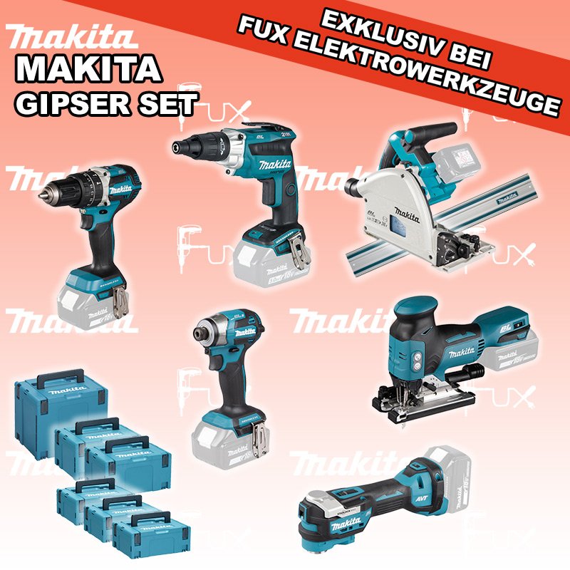 Das Ladenlokal bleibt vom 25. Dezember 2025 bis am 04. Januar 2026 geschlossen. Bestellungen und Lieferungen von Neugeräten werden trotz Ferienabwesenheit in gewohnter Fux-Manier entgegengenommen und ausgeliefert. Zu "Gipser Set" von Makita FUX SPECIAL EXKLUSIV BEI FUX Makita Gipser Set 11 SOLO Bestell- und Artikelnummer: maGipser Set 11 SOLO DHP484ZJ Akku-SchlagbohrschrauberAkkuspannung 18 V Drehzahlen 0-500 / 0-2000 U/min Drehmoment hart / weich 54 / 30 Nm Gewicht 1.6 kgInfos DFS251ZJ Akku-SchrauberAkkuspannung 18 V Drehzahl 0-2500 U/min Werkzeugaufnahme 1/4" (Innensechskant) Gewicht 1.5 kgInfos DTM52Z Multifunktions WerkzeugAkkuspannung 18 V Schwingungen 10000 - 20000 min-1 Werkzeugaufnahme Starlock Max System Gewicht inkl. Akku 2.0 kg Infos DJV18ZJ Akku-StichsägeAkkuspannung 18 V Hubzahl 800 - 3500/ min Schnittleistung Holz 135 mm / Stahl 10 mm Gewicht 2.5 kgInfos DTD173Z Akku-SchlagschrauberAkkuspannung 18 V Anziehdrehmoment 20 / 50 / 170 / 180 Nm Werkzeugaufnahme 1/4" (Innensechskant) Gewicht inkl. Akku 1.2 - 1.5 kgInfos DSP601ZJU Eintauch-KreissägeAkkuspannung 2 x 18 V Sägeblatt (Ø) 165 mm Schnitttiefe bei 90° 56 mm Gewicht (EPTA) 5.1 kg Infos MAKPAC Gr. 3Produktabmessung (L x B x H) 377 x 277 x 176 mm Infos Einsatz für DTM52 Einsatz für DTM52 Makpac Koffer Typ C (821551-8) Infos MAKPAC Gr. 2Produktabmessung (L x B x H) 395 x 295 x 163 mm Infos Einsatz für diverse Schlagschrauber Einsatz für DDF083, DDF483, DHP483, DTD134, DTD137, DTD146, DTD148, DTD152, DTD153, DTD154, DTD155, DTD170, DTD171, DTP131, DTP141, DTS130, DTS131, DTS141, DTW180, DTW181, DTW250, DTW251, DTW284, DTW285Infos Führungsschiene L = 140 cmgeeignet für SP6000 Handkreissäge mit passenden Adapter Auch für weitere Handkreissägen und Stichsägen geeignet mit passendem Adapter. ( 194579-2 )Infos OHNE AKKUS UND LADEGERÄT Standard-Ausrüstung In diesem Set enthalten: DHP484ZJ Akku-Schlagbohrschrauber DFS251ZJ Akku-Schrauber DTM52Z Multifunktions Werkzeug DJV18ZJ Akku-Stichsäge DTD173Z Akku-Schlagschrauber DSP601ZJU Eintauch-Kreissäge MAKPAC Gr. 3 Einsatz für DTM52 MAKPAC Gr. 2 Einsatz für diverse Schlagschrauber Führungsschiene L = 140 cm Geliefert im Koffer Zubehör Listenpreis CHF 2'202.00 Fuxpreis CHF 1'525.00 inkl. 8.1% MwSt, inkl vRG Versand CHF 20.00 Kein Grauimport! Produkt bestellen 1 Stück 2 Stück 3 Stück 4 Stück 5 Stück 6 Stück 7 Stück 8 Stück 9 Stück 10 Stück Option: Makita BL 1860 B ( Li-lon Akku ) für CHF 95.- statt CHF 124.-Infos Alle Angaben ohne Gewähr und solange Vorrat reicht!Wiederverkäufer werden? Produkt als PDF NEUHEITAKTION 30%