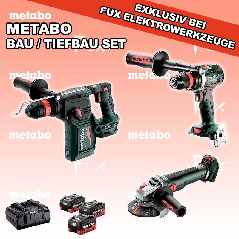 Das Ladenlokal bleibt vom 25. Dezember 2025 bis am 04. Januar 2026 geschlossen. Bestellungen und Lieferungen von Neugeräten werden trotz Ferienabwesenheit in gewohnter Fux-Manier entgegengenommen und ausgeliefert. Zu "Bau / Tiefbau Set" von Metabo FULL Service: 36 Monate zum Nulltarif für Sie! Weitere Infos zum FULL Service FUX SPECIAL EXKLUSIV BEI FUX Metabo Bau / Tiefbau Set 5 Bestell- und Artikelnummer: Bau / Tiefbau Set 5 BS 18 LTX BL Q I Akku-BohrschrauberAkkuspannung 18 V Drehzahl 0-550 / 0-2000 U/min Drehmoment hart / weich 130 / 65 Nm Gewicht (mit Akkupack) 2.3 kgInfos KH 18 LTX BL 24 Q Akku-KombihammerAkkuspannung 18 V Einzelschlagstärke 2.2 J Bohrleistung in Beton 24 mm Gewicht ohne Akkupack 3 kgInfos WVB 18 LT BL 11-125 Quick Akku-WinkelschleiferAkkuspannung 18 V Drehzahl 2.800 - 10.000 / min Ø 125 mm Scheiben Gewicht (mit Akkupack) 2.5 kgInfos 3 x 18 V, 5.5 Ah, LiHD Akkupack18 V 5.5 Ah ( LiHD Akkus ) Infos ASC 145, 12 - 36 V "Air Cooled" LadegerätZum Aufladen aller Li-Power Schiebesitz-Akkupacks (12 V - 36 V). Ladestrom 8.0 AInfos Standard-Ausrüstung In diesem Set enthalten: BS 18 LTX BL Q I Akku-Bohrschrauber KH 18 LTX BL 24 Q Akku-Kombihammer WVB 18 LT BL 11-125 Quick Akku-Winkelschleifer 3 x 18 V, 5.5 Ah, LiHD Akkupack ASC 145, 12 - 36 V "Air Cooled" Ladegerät Listenpreis CHF 1'509.00 Fuxpreis CHF 1'031.00 inkl. 8.1% MwSt, inkl vRG Frankolieferung Kein Grauimport! Produkt bestellen 1 Stück 2 Stück 3 Stück 4 Stück 5 Stück 6 Stück 7 Stück 8 Stück 9 Stück 10 Stück Alle Angaben ohne Gewähr und solange Vorrat reicht!Wiederverkäufer werden? Produkt als PDF NEUHEITAKTION 31%