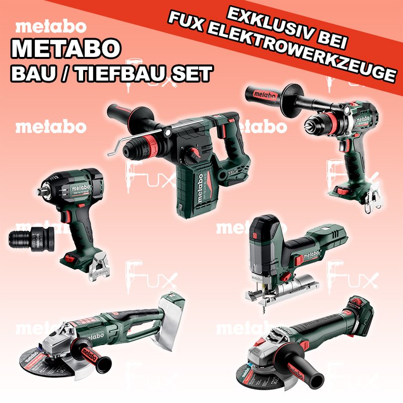Zu "Bau / Tiefbau Set" von Metabo FULL Service: 36 Monate zum Nulltarif für Sie! Weitere Infos zum FULL Service FUX SPECIAL EXKLUSIV BEI FUX Metabo Bau / Tiefbau Set 10 SOLO Bestell- und Artikelnummer: Bau / Tiefbau Set 10 SOLO BS 18 LTX BL Q I Akku-BohrschrauberAkkuspannung 18 V Drehzahl 0-550 / 0-2000 U/min Drehmoment hart / weich 130 / 65 Nm Gewicht (mit Akkupack) 2.3 kgInfos ST 18 LT 130 BL Akku-StichsägeAkkuspannung 18 V Hubzahl 1000-3.500 /min Gewicht ohne Akkupack 1.5 kgInfos KH 18 LTX BL 24 Q Akku-KombihammerAkkuspannung 18 V Einzelschlagstärke 2.2 J Bohrleistung in Beton 24 mm Gewicht ohne Akkupack 3 kgInfos WVB 18 LT BL 11-125 Quick Akku-WinkelschleiferAkkuspannung 18 V Drehzahl 2.800 - 10.000 / min Ø 125 mm Scheiben Gewicht (mit Akkupack) 2.5 kgInfos WPB 36-18 LTX BL 24-230 Akku-WinkelschleiferAkkuspannung 2 x 18 V Drehzahl 6600 U / min Ø 230 mm Scheiben Gewicht (mit Akkupack) 6.5 kgInfos SSW 18 LTX 550 BL Akku-SchlagschrauberAkkuspannung 18 V Anziehdrehmoment 550 Nm Werkzeugaufnahme 1/2" Gewicht ohne Akkupack 1,4 kgInfos Adapter für Lube-Shuttle® 400GAdapter zum Umrüsten von Fettbehälter auf Lube-Shuttle®* Kartusche 400g geeignet für FP 18 LTXInfos Registriere die in diesem Set vorhandenen Metabo Maschinen auf metabo.ch, und ergattere dir bis zu 5 Gratis Akkus!Zusätzlich offerieren wir zu diesem Set einen Gratis Akku!OHNE AKKUS UND LADEGERÄT Standard-Ausrüstung In diesem Set enthalten: BS 18 LTX BL Q I Akku-Bohrschrauber ST 18 LT 130 BL Akku-Stichsäge KH 18 LTX BL 24 Q Akku-Kombihammer WVB 18 LT BL 11-125 Quick Akku-Winkelschleifer WPB 36-18 LTX BL 24-230 Akku-Winkelschleifer SSW 18 LTX 550 BL Akku-Schlagschrauber Adapter für Lube-Shuttle® 400G Listenpreis CHF 2'163.00 Fuxpreis CHF 1'478.00 inklusive 8.1% MwSt Frankolieferung Kein Grauimport! Produkt bestellen 1 Stück 2 Stück 3 Stück 4 Stück 5 Stück 6 Stück 7 Stück 8 Stück 9 Stück 10 Stück Alle Angaben ohne Gewähr und solange Vorrat reicht!Wiederverkäufer werden? Produkt als PDF NEUHEIT 31%