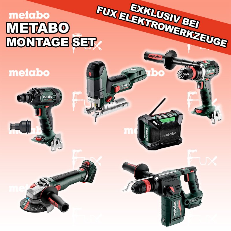 Zu "Montage Set" von Metabo FULL Service: 36 Monate zum Nulltarif für Sie! Weitere Infos zum FULL Service Dieses Produkt ist CAS kompatibel! Weitere Infos zu CAS FUX SPECIAL EXKLUSIV BEI FUX Metabo Montage Set 5 SOLO Bestell- und Artikelnummer: Montage Set 5 SOLO ST 18 LT 130 BL Akku-StichsägeAkkuspannung 18 V Hubzahl 1000-3.500 /min Gewicht ohne Akkupack 1.5 kgInfos KH 18 LTX BL 24 Q Akku-KombihammerAkkuspannung 18 V Einzelschlagstärke 2.2 J Bohrleistung in Beton 24 mm Gewicht ohne Akkupack 3 kgInfos WB 18 LTX BL 15-125 Quick Akku-Winkelschleifer Akkuspannung 18 V so stark wie ein 1500 Watt Netzgerät Drehzahl 10000 U / min Ø 125 mm Scheiben Gewicht mit Akkupack 2,7 kgInfos SSW 18 LTX 300 BL Akku-SchlagschrauberAkkuspannung 18 V Anziehdrehmoment 300 Nm Werkzeugaufnahme 1/2" Gewicht 1.7 kgInfos R 12-18 DAB+ BT Akku-BaustellenradioDAB+ Akkuspannung 12 V / 18 V Extreme Akkupacks mit 14,4 und 18 Volt Gewicht 1.85 kgInfos BS 18 LTX BL Q I Akku-BohrschrauberAkkuspannung 18 V Drehzahl 0-550 / 0-2000 U/min Drehmoment hart / weich 130 / 65 Nm Gewicht (mit Akkupack) 2.3 kgInfos Reduktions Adapter 1/2" auf 1/4" Aufnahme Max. 350 Nm Länge 45 mmInfos Registriere die in diesem Set vorhandenen Metabo Maschinen auf metabo.ch, und ergattere dir bis zu 5 Gratis Akkus!Zusätzlich offerieren wir zu diesem Set einen Gratis Akku!OHNE AKKUS UND LADEGERÄT Standard-Ausrüstung In diesem Set enthalten: ST 18 LT 130 BL Akku-Stichsäge KH 18 LTX BL 24 Q Akku-Kombihammer WB 18 LTX BL 15-125 Quick Akku-Winkelschleifer SSW 18 LTX 300 BL Akku-Schlagschrauber R 12-18 DAB+ BT Akku-Baustellenradio BS 18 LTX BL Q I Akku-Bohrschrauber Reduktions Adapter Zubehör Verbrauchsmaterial Listenpreis CHF 1'899.00 Fuxpreis CHF 1'139.00 inklusive 8.1% MwSt Versand CHF 40.00 Kein Grauimport! Produkt bestellen 1 Stück 2 Stück 3 Stück 4 Stück 5 Stück 6 Stück 7 Stück 8 Stück 9 Stück 10 Stück Alle Angaben ohne Gewähr und solange Vorrat reicht!Wiederverkäufer werden? Produkt als PDFVideo LiHD 1Video LiHD 2 NEUHEITAKTION 40%